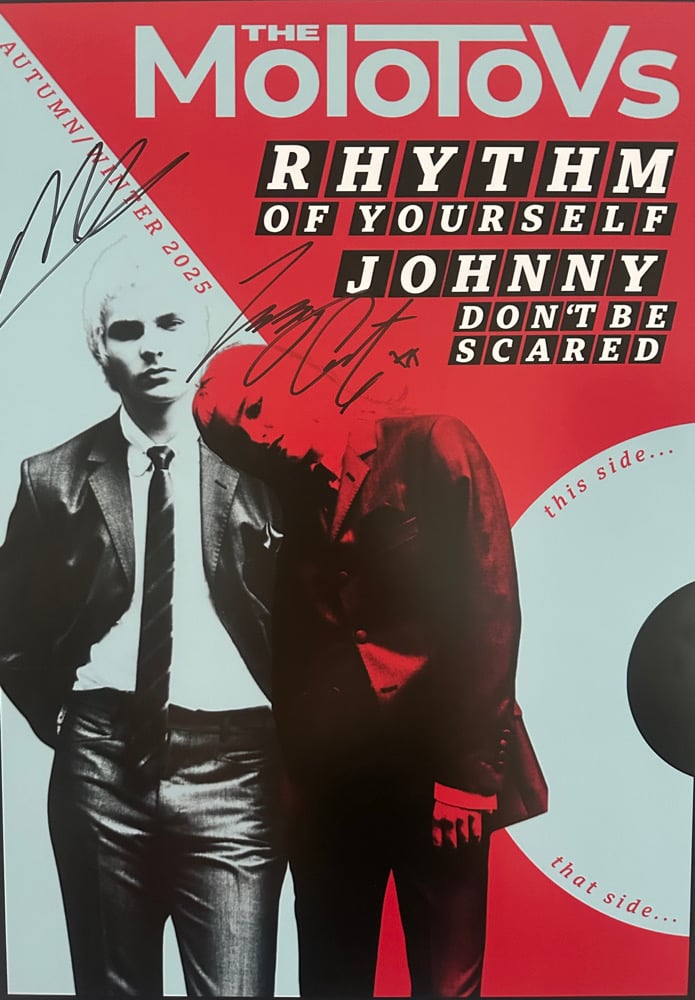 Designed by Issey and personally signed by herself and Matt in black marker to celebrate the release of their third single Rhythm Of Yourself and Johnny Don’t Be Scared on the flip.